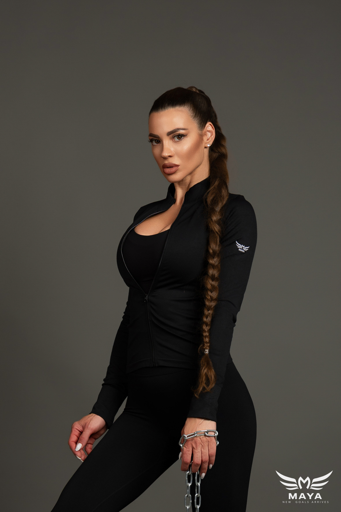 Фигурален дамски суитшърт с изчистен дизайн, подходящ за преходните сезони, тренировки и градска визия. Бродираното лого MAYA на ръкава придава завършен, луксозен щрих, без да е натрапчиво.